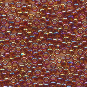 This is a Japanese MIYUKI seed bead with a rainbow of colors on the surface. In the 15/0 size, 20 grams of beads yield approximately 5,000 beads, or about 5 meters on a thread; in the 11/0 size, 20 grams of beads yield approximately 2,200 beads, or about 2.6 meters on a thread. Beads are packed loose.