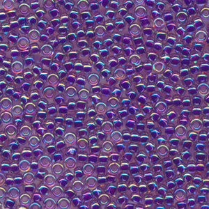 This is a Japanese MIYUKI seed bead with rainbow applied to the surface of the beads, which are colored with pigments and dyes in the holes. In the 15/0 size, 20 grams of beads yield approximately 5,000 beads, or about 5 meters on a thread; in the 11/0 size, 20 grams of beads yield approximately 2,200 beads, or about 2.6 meters on a thread; in the 8/0 size, 20 grams of beads yield approximately 780 beads, or about 1.5 meters on a thread; in the 6/0 size, 20 grams of beads yield approximately 240 beads, or about 0.6 meters on a thread. Beads are packed loose.