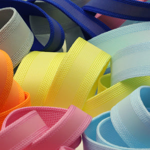This is the Aurora Reflect Knit Tape from SHINDO (S.I.C.). This knit tape has a reflective finish (aurora borealis reflection) that increases visibility at night. The reflective material is translucent, so it does not stand out during the day and does not detract from the design (the reflectivity is inferior to that of common silver retroreflective materials). It is also a highly fashionable item because the reflective light shines in multiple colors like an aurora borealis. Based on the standard knit tape (SIC-105), this is a highly recommended product that combines the flexibility of knit tape with features such as ease of sewing on slight curves. The 9mm type is 5mm and the 12mm type is 7mm aurora reflective print. Three meter-cut products are sold as samples to check the actual product or for prototypes. Please be sure to check the actual product with a three meter-cut product before purchasing in a roll.