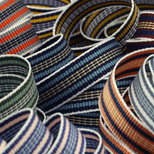 This is a recycled polyester striped grosgrain ribbon manufactured by SHINDO (S.I.C.). To help realize a sustainable society, this striped grosgrain ribbon uses environmentally conscious recycled polyester yarn (virgin). Featuring a classic color scheme with three stripes of varying widths, it is recommended for children's clothing, casual wear, and accessories like hats and bags. If you require an especially eco-friendly striped ribbon, please consider this option. Three meter-cut products are sold as samples to check the actual product or for prototypes. Please be sure to check the actual product with a three meter-cut product before purchasing in a roll.
