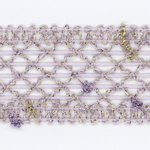This is the Lame Crochet Lace from SHINDO (S.I.C.). Crochet lace-like tape with glittering glitter. It is recommended as a clothing material for interiors, small items, and miscellaneous uses. Three meter-cut products are sold as samples to check the actual product or for prototypes. Please be sure to check the actual product with a three meter-cut product before purchasing in a roll.