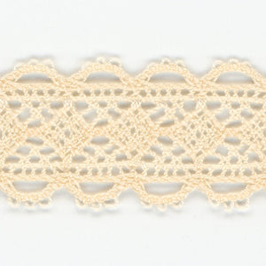 This is the Torchon Lace from SHINDO (S.I.C.). Made of 100% natural cotton fiber, this lace has a rustic, warm and natural taste with a diamond pattern and picot ends. The use of fine count yarns gives it a light and delicate texture, making it a recommended material for children's clothing and general merchandise applications. In order to minimize shrinkage during washing and dyeing, all colors, including unbleached ones, have been treated to prevent shrinkage, so if you've ever had a lace sewn to a fabric that has shrunk after washing, don't worry. Three meter-cut products are sold as samples to check the actual product or for prototypes. Please be sure to check the actual product with a three meter-cut product before purchasing in a roll.
