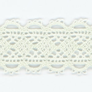 This is the Torchon Lace from SHINDO (S.I.C.). Made of 100% natural cotton fiber, this lace has a rustic, warm and natural taste with a diamond pattern and picot ends. The use of fine count yarns gives it a light and delicate texture, making it a recommended material for children's clothing and general merchandise applications. In order to minimize shrinkage during washing and dyeing, all colors, including unbleached ones, have been treated to prevent shrinkage, so if you've ever had a lace sewn to a fabric that has shrunk after washing, don't worry. Three meter-cut products are sold as samples to check the actual product or for prototypes. Please be sure to check the actual product with a three meter-cut product before purchasing in a roll.