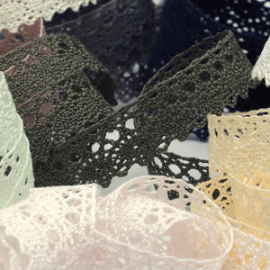 This is the Torchon Lace from SHINDO (S.I.C.). This lace is made of 100% natural cotton fiber, with a rustic, warm and natural taste. The use of fine count yarns gives it a light and delicate texture, making it a recommended material for children's clothing and general merchandise applications. In order to minimize shrinkage during washing and dyeing, all colors, including unbleached ones, have been treated to prevent shrinkage, so if you've ever had a lace sewn to a fabric that has shrunk after washing, don't worry. Three meter-cut products are sold as samples to check the actual product or for prototypes. Please be sure to check the actual product with a three meter-cut product before purchasing in a roll.