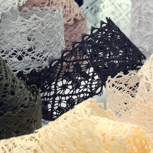 This is the Torchon Lace from SHINDO (S.I.C.). Made of 100% natural fiber cotton, the lace features a double-sided picot butterfly design in a rustic and warm natural taste. The use of fine count yarns gives it a light and delicate texture, making it a recommended material for children's clothing and general merchandise applications. In order to minimize shrinkage during washing and dyeing, all colors, including unbleached ones, have been treated to prevent shrinkage, so if you've ever had a lace sewn to a fabric that has shrunk after washing, don't worry. Three meter-cut products are sold as samples to check the actual product or for prototypes. Please be sure to check the actual product with a three meter-cut product before purchasing in a roll.