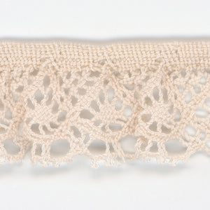 This is the Stretch Torchon Lace from SHINDO (S.I.C.). Stretchy ruffled lace, using fine thread, has a light and delicate texture. Recommended material for children's clothing and general merchandise applications. In order to minimize shrinkage during washing and dyeing, all colors, including unbleached ones, have been treated to prevent shrinkage, so if you've ever had a lace sewn to a fabric that has shrunk after washing, don't worry. Three meter-cut products are sold as samples to check the actual product or for prototypes. Please be sure to check the actual product with a three meter-cut product before purchasing in a roll.