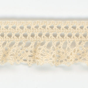 This is the Stretch Torchon Lace from SHINDO (S.I.C.). It is a small, ruffled lace with elasticity, using fine thread, and has a light and delicate texture. Recommended material for children's clothing and general merchandise applications. In order to minimize shrinkage during washing and dyeing, all colors, including unbleached ones, have been treated to prevent shrinkage, so if you've ever had a lace sewn to a fabric that has shrunk after washing, don't worry. Three meter-cut products are sold as samples to check the actual product or for prototypes. Please be sure to check the actual product with a three meter-cut product before purchasing in a roll.
