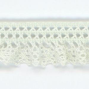 This is the Stretch Torchon Lace from SHINDO (S.I.C.). It is a small, ruffled lace with elasticity, using fine thread, and has a light and delicate texture. Recommended material for children's clothing and general merchandise applications. In order to minimize shrinkage during washing and dyeing, all colors, including unbleached ones, have been treated to prevent shrinkage, so if you've ever had a lace sewn to a fabric that has shrunk after washing, don't worry. Three meter-cut products are sold as samples to check the actual product or for prototypes. Please be sure to check the actual product with a three meter-cut product before purchasing in a roll.