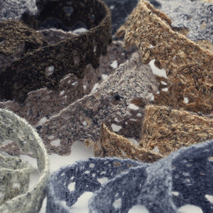 This is the Melange Torchon Lace from SHINDO (S.I.C.). A melange lace with a rustic and deep look, mixed with the gentle texture of cotton and black cotton of crude hemp material, recommended for interior and sundry applications. In order to minimize shrinkage during washing and dyeing, all colors, including unbleached ones, have been treated to prevent shrinkage, so if you've ever had a lace sewn to a fabric that has shrunk after washing, don't worry. Three meter-cut products are sold as samples to check the actual product or for prototypes. Please be sure to check the actual product with a three meter-cut product before purchasing in a roll.