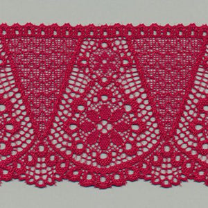 This is the Stretch Trimming Lace from SHINDO (S.I.C.). Lace with an elastic, dynamic pattern woven on a Russell loom, complex and delicate patterns, but also thin and flat. It is recommended for casual clothing, dance costumes, underwear, children's clothing, and interior accessories. In order to minimize shrinkage during washing and dyeing, all colors, including unbleached ones, have been treated to prevent shrinkage, so if you've ever had a lace sewn to a fabric that has shrunk after washing, don't worry. Three meter-cut products are sold as samples to check the actual product or for prototypes. Please be sure to check the actual product with a three meter-cut product before purchasing in a roll.