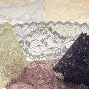 This is the Stretch Trimming Lace from SHINDO (S.I.C.). An elastic leaf-patterned lace woven on a Russell loom, with an intricate and delicate pattern, but also thin and flat. It is recommended for casual clothing, dance costumes, underwear, children's clothing, and interior accessories. In order to minimize shrinkage during washing and dyeing, all colors, including unbleached ones, have been treated to prevent shrinkage, so if you've ever had a lace sewn to a fabric that has shrunk after washing, don't worry. Three meter-cut products are sold as samples to check the actual product or for prototypes. Please be sure to check the actual product with a three meter-cut product before purchasing in a roll.