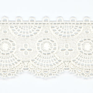 This is the Embroidered Chemical Lace from SHINDO (S.I.C.). This is a modern patterned lace that is embroidered but has a translucent feel as if it were woven yarn. It is recommended for casual clothing, dance costumes, children's clothing, and interior accessories. In order to minimize shrinkage during washing and dyeing, all colors, including unbleached ones, have been treated to prevent shrinkage, so if you've ever had a lace sewn to a fabric that has shrunk after washing, don't worry. Three meter-cut products are sold as samples to check the actual product or for prototypes. Please be sure to check the actual product with a three meter-cut product before purchasing in a roll.