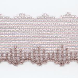 This is the Embroidered Tulle Lace from SHINDO (S.I.C.). Combining knitted lace and embroidered lace, this dotted scalloped lace has a beautiful harmony between the light tulle weave and the fine embroidery. It is recommended for casual clothing, dance costumes, children's clothing, and interior accessories. In order to minimize shrinkage during washing and dyeing, all colors, including unbleached ones, have been treated to prevent shrinkage, so if you've ever had a lace sewn to a fabric that has shrunk after washing, don't worry. Three meter-cut products are sold as samples to check the actual product or for prototypes. Please be sure to check the actual product with a three meter-cut product before purchasing in a roll.