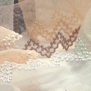 • This is the Embroidered Tulle Lace from SHINDO (S.I.C.). Combining knitted lace and embroidered lace, this dotted scalloped lace has a beautiful harmony between the light tulle weave and the fine embroidery. It is recommended for casual clothing, dance costumes, children's clothing, and interior accessories. In order to minimize shrinkage during washing and dyeing, all colors, including unbleached ones, have been treated to prevent shrinkage, so if you've ever had a lace sewn to a fabric that has shrunk after washing, don't worry. Three meter-cut products are sold as samples to check the actual product or for prototypes. Please be sure to check the actual product with a three meter-cut product before purchasing in a roll.