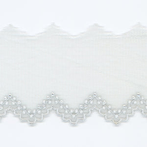 • This is the Embroidered Tulle Lace from SHINDO (S.I.C.). Combining knitted lace and embroidered lace, this dotted scalloped lace has a beautiful harmony between the light tulle weave and the fine embroidery. It is recommended for casual clothing, dance costumes, children's clothing, and interior accessories. In order to minimize shrinkage during washing and dyeing, all colors, including unbleached ones, have been treated to prevent shrinkage, so if you've ever had a lace sewn to a fabric that has shrunk after washing, don't worry. Three meter-cut products are sold as samples to check the actual product or for prototypes. Please be sure to check the actual product with a three meter-cut product before purchasing in a roll.