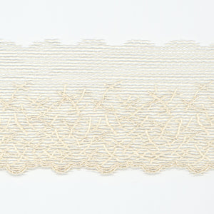 • This is the Embroidered Tulle Lace from SHINDO (S.I.C.). Combining braided lace and embroidered lace, this single-sided scalloped lace harmonizes with the light tulle weave and fine embroidery. It is recommended for casual clothing, dance costumes, children's clothing, and interior accessories. In order to minimize shrinkage during washing and dyeing, all colors, including unbleached ones, have been treated to prevent shrinkage, so if you've ever had a lace sewn to a fabric that has shrunk after washing, don't worry. Three meter-cut products are sold as samples to check the actual product or for prototypes. Please be sure to check the actual product with a three meter-cut product before purchasing in a roll.