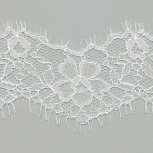 This is the Leavers Trimming Lace from SHINDO (S.I.C.). Characterized by its dense and fine floral pattern and zigzag shape, leavers lace loom is a rare technique that requires a high level of technology to produce due to the large number of yarns used and the complex structure. It is recommended for women's clothing, dance costumes, interior design and other miscellaneous applications. In order to minimize shrinkage during washing and dyeing, all colors, including unbleached ones, have been treated to prevent shrinkage, so if you've ever had a lace sewn to a fabric that has shrunk after washing, don't worry. Three meter-cut products are sold as samples to check the actual product or for prototypes. Please be sure to check the actual product with a three meter-cut product before purchasing in a roll.