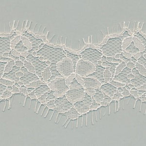 This is the Leavers Trimming Lace from SHINDO (S.I.C.). Characterized by its dense and fine floral pattern and zigzag shape, leavers lace loom is a rare technique that requires a high level of technology to produce due to the large number of yarns used and the complex structure. It is recommended for women's clothing, dance costumes, interior design and other miscellaneous applications. In order to minimize shrinkage during washing and dyeing, all colors, including unbleached ones, have been treated to prevent shrinkage, so if you've ever had a lace sewn to a fabric that has shrunk after washing, don't worry. Three meter-cut products are sold as samples to check the actual product or for prototypes. Please be sure to check the actual product with a three meter-cut product before purchasing in a roll.