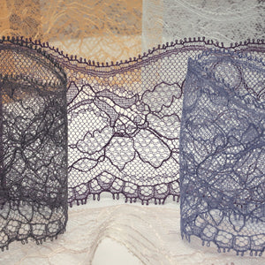 This is the Leavers Trimming Lace from SHINDO (S.I.C.). Characterized by its intricate and detailed antique pattern, leavers lace loom is a rare technique that requires a high level of technology to produce due to the large number of yarns used and the complex structure. It is recommended for women's clothing, dance costumes, interior design and other miscellaneous applications. In order to minimize shrinkage during washing and dyeing, all colors, including unbleached ones, have been treated to prevent shrinkage, so if you've ever had a lace sewn to a fabric that has shrunk after washing, don't worry. Three meter-cut products are sold as samples to check the actual product or for prototypes. Please be sure to check the actual product with a three meter-cut product before purchasing in a roll.