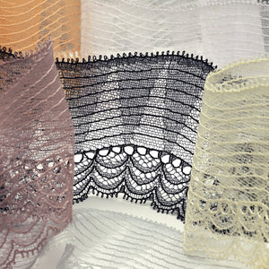 This is the Leavers Trimming Lace from SHINDO (S.I.C.). Characterized by its intricate and detailed layered design, leavers lace looms use a large number of yarns and have a complicated structure, making it a rare lace with a technique that requires a high level of technical skill to produce. It is recommended for ladies' wear, dance costumes, and miscellaneous goods such as interior decorations. In order to minimize shrinkage during dyeing and washing, all colors, including the raw silk, are shrink-proofed. (T_T). Three meter-cut products are sold as samples to check the actual product or for prototypes. Please be sure to check the actual product with a three meter-cut product before purchasing in a roll.