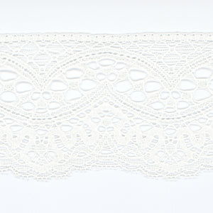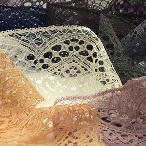 This is the Leavers Trimming Lace from SHINDO (S.I.C.). Characterized by its random lace holes and dynamic patterns, leavers lace loom is a rare technique that requires a high level of technology to produce due to the large number of yarns used and the complex structure. It is recommended for women's clothing, dance costumes, interior design and other miscellaneous applications. In order to minimize shrinkage during washing and dyeing, all colors, including unbleached ones, have been treated to prevent shrinkage, so if you've ever had a lace sewn to a fabric that has shrunk after washing, don't worry.Three meter-cut products are sold as samples to check the actual product or for prototypes. Please be sure to check the actual product with a three meter-cut product before purchasing in a roll.