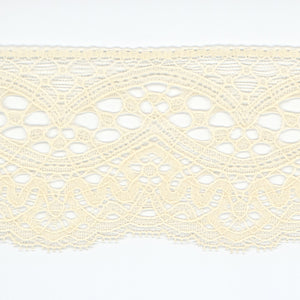 This is the Leavers Trimming Lace from SHINDO (S.I.C.). Characterized by its random lace holes and dynamic patterns, leavers lace loom is a rare technique that requires a high level of technology to produce due to the large number of yarns used and the complex structure. It is recommended for women's clothing, dance costumes, interior design and other miscellaneous applications. In order to minimize shrinkage during washing and dyeing, all colors, including unbleached ones, have been treated to prevent shrinkage, so if you've ever had a lace sewn to a fabric that has shrunk after washing, don't worry.Three meter-cut products are sold as samples to check the actual product or for prototypes. Please be sure to check the actual product with a three meter-cut product before purchasing in a roll.