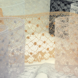 This is the Leavers Trimming Lace from SHINDO (S.I.C.). This lace is characterized by its fine, detailed patterns and flowing designs. Leavers lace looms use a large number of yarns and have a complicated structure, making it a rare and highly technical lace that requires a high level of skill to produce. It is recommended for ladies' wear, dance costumes, and miscellaneous goods such as interior decorations. In order to minimize shrinkage during dyeing and washing, all colors, including the raw silk, are shrink-proofed. (T_T). Three meter-cut products are sold as samples to check the actual product or for prototypes. Please be sure to check the actual product with a three meter-cut product before purchasing in a roll.