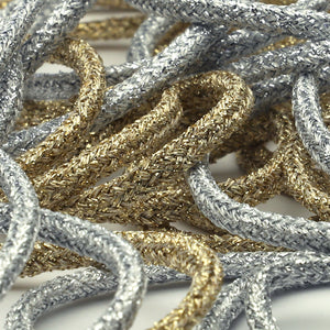 This is the Metallic Trimming Braid (round cord) from SHINDO (S.I.C.). Instead of wrapping lame tightly around the core yarn, we dare to use lame yarn made to show a little of the white base color, making this round cord a little less lame. Despite the use of lame thread, it has a softer finish, making it easier to use and more comfortable, and it is also more suitable for casual use. Since it has a sense of presence and glamour, it is recommended for use as an accent for stage costumes, dresses, and accessories. Three meter-cut products are sold as samples to check the actual product or for prototypes. Please be sure to check the actual product with a three meter-cut product before purchasing in a roll.