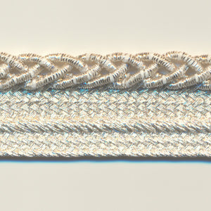 This is the Metallic Piping from SHINDO (S.I.C.). This is a high-grade, elegant cord piping with gold and silver lame on the heads and crossed out in a highly designed, elegant and shiny design. This tape is recommended for trimming and decorating the edges of stage costumes and dresses because of its presence and glamour. Three meter-cut products are sold as samples to check the actual product or for prototypes. Please be sure to check the actual product with a three meter-cut product before purchasing in a roll.