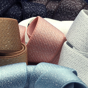 This is the Lame Waist Stretch Tape from SHINDO (S.I.C.). This elastic tape has a satin sheen, silver lame, and firm thickness. The elastic is made of polyurethane, which is soft to the touch (even the lame part is not coarse and gentle against the skin) and is recommended for use as an elastic waistband. Three meter-cut products are sold as samples to check the actual product or for prototypes. Please be sure to check the actual product with a three meter-cut product before purchasing in a roll.