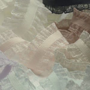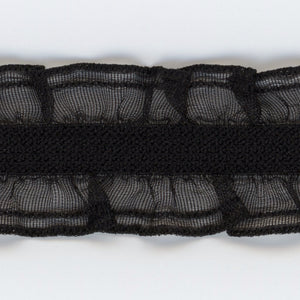 This is the Double Frill Stretch from SHINDO (S.I.C.). This is an elastic tape with two lines on the edge of a sheer organdy ruffle, with ruffled ends that emphasize the ruffle lines more. It has the luster and lightness that only nylon materials can offer, and is compatible with thin body fabrics. It is recommended for use in casual clothing and general merchandise. Three meter-cut products are sold as samples to check the actual product or for prototypes. Please be sure to check the actual product with a three meter-cut product before purchasing in a roll.