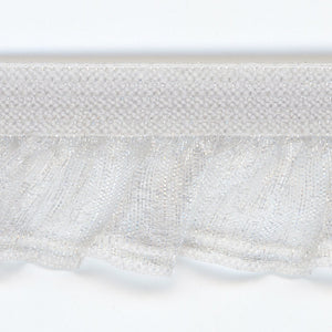 This is the Single Frill Stretch from SHINDO (S.I.C.). This elastic ruffle tape has two lines on the edge of a sheer organdy ruffle, emphasizing the lines of the ruffle even more. It has the luster and lightness that only nylon materials can offer, and is compatible with thin body fabrics. It is recommended for use in casual clothing and general merchandise. Three meter-cut products are sold as samples to check the actual product or for prototypes. Please be sure to check the actual product with a three meter-cut product before purchasing in a roll.