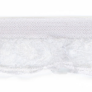 This is the Single Frill Stretch from SHINDO (S.I.C.). This elastic ruffle tape has two lines on the edge of a sheer organdy ruffle, emphasizing the lines of the ruffle even more. It has the luster and lightness that only nylon materials can offer, and is compatible with thin body fabrics. It is recommended for use in casual clothing and general merchandise. Three meter-cut products are sold as samples to check the actual product or for prototypes. Please be sure to check the actual product with a three meter-cut product before purchasing in a roll.